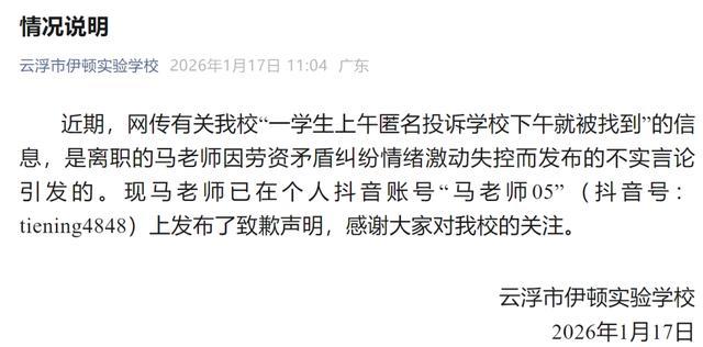 近期,网传有关我校“一学生上午匿名投诉学校下午就被找到”的信息,是离职的马老师因劳资矛盾纠纷情绪激动失控而发布的不实言论引发的。现马老师已在个人抖音账号“马老师05”(抖音号:tiening4848)上发布了致歉声明,感谢大家对我校的关注。